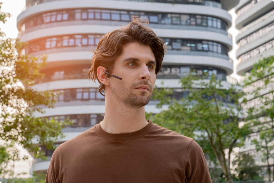 A diferencia de los auriculares tradicionales que cubren tus oídos y te aíslan de tu entorno, el diseño open-ear de los OpenComm2 te mantiene conectado con el mundo sin comprometer la comodidad ni la calidad del audio.